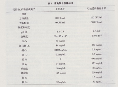 水對養(yǎng)分的消化、吸收、轉(zhuǎn)運(yùn)和廢物排泄有著重要的作用。水是廉價(jià)、容易得到,也是容易被忽略的重要養(yǎng)分。在大生產(chǎn)中通常會(huì)注意給水的數(shù)量,即會(huì)經(jīng)常檢查飲水乳頭的好壞,卻容易忽視飲水的質(zhì)量。實(shí)際上在生產(chǎn)中經(jīng)常遇到的雞群生產(chǎn)成績不正常,易患卵黃性腹膜炎及其他疾病,這種情況通常與飲水質(zhì)量有關(guān)。表1列出了家禽飲水質(zhì)量的相關(guān)標(biāo)準(zhǔn),在生產(chǎn)中重視飲水質(zhì)量會(huì)給種雞生產(chǎn)帶來事半功倍的效果。